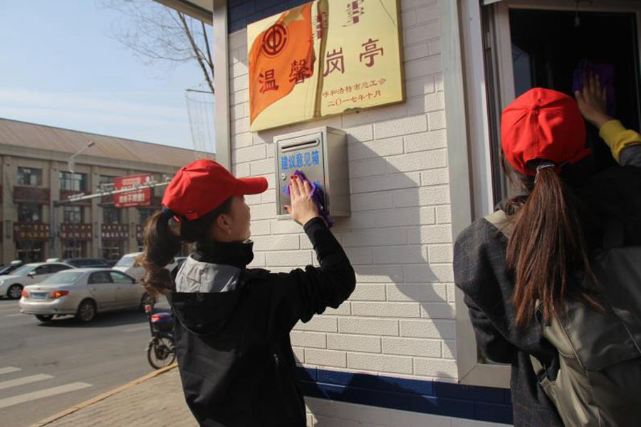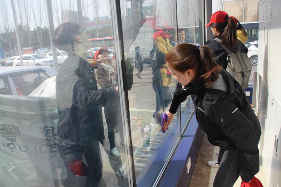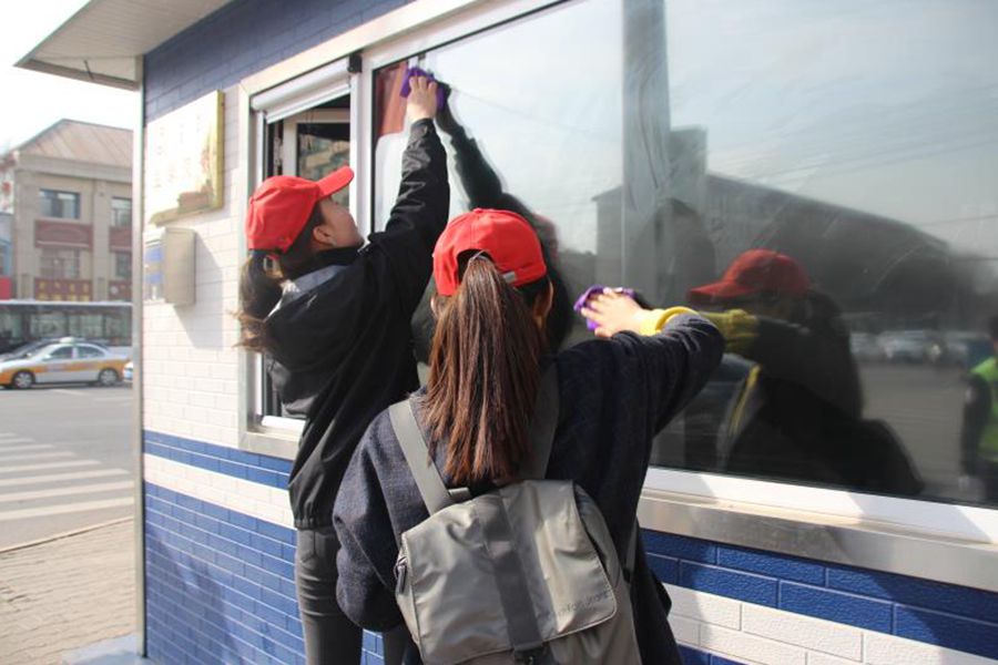 为了弘扬雷锋精神, 深化青年志愿者活动,3月11日上午,我院正e联盟组织xx名学生志愿者来到昭乌达路进行清洗岗亭活动。