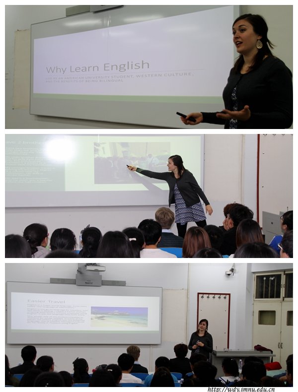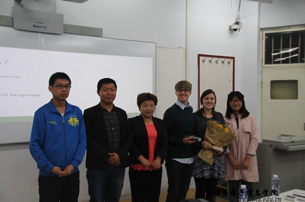大会开始,孙咏萍副教授向大家介绍主讲人,代表同学们欢迎并感谢外国朋友的到来。接着,Natalie Mills以风趣幽默的风格,标准易懂的语言与我们分享有关美国文化,特别介绍美国的大学、传统节日、以及美国的婚礼等。她结合自己的亲生经历,加以丰富的讲义资料,给我们呈现出生动的美国文化特色。随后,同学们与外国朋友进行交流,向他们了解自己感兴趣的问题,在主讲Natalie Mills与外教Matt的认真解答下,同学们收获很多。大会最后,同学们为外国朋友送上精心准备的礼物,并合影留念,至此本次活动在一片欢乐的氛围下圆满结束。