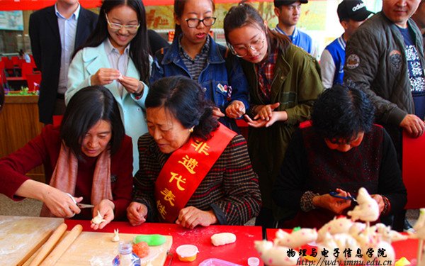 本网讯 2017年3月31日上午,全城非物质文化遗产体验第二站落脚内师大,在师大食堂二楼展开了以“寒食节里看非遗,传统技艺代代传”为主题的现场传习活动。本次活动由呼和浩特市非物质文化遗产保护中心、内蒙古师范大学文化产业发展研究中心和内蒙古科学技术普及学会主办,内蒙古师范大学赛罕后勤集团饮食服务中心、物理与电子信息学院和国际交流学院承办。