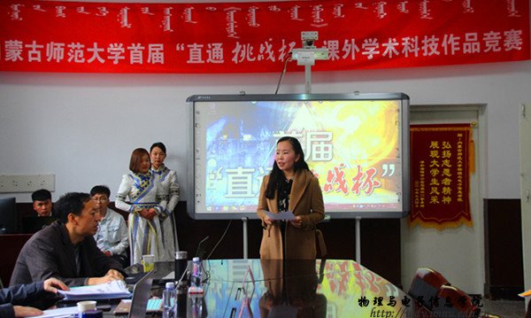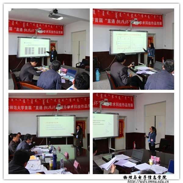 8日上午首届“直通挑战杯”课外学术科技作品竞赛初赛在物电楼会议室举办,项目为自然科学类学术论文。赛制为三分钟作品讲解及评委问答,得分高者进入下一轮。大赛开始由物理与电子信息学院团总支书记萨其尔老师主持,党总支副书记何小龙老师致欢迎辞。评委由学院院长特古斯教授、实践创新部主任曹永军教授与朝克夫副教授担任,评分标准为科学性、先进性、现实意义三个方面。比赛过程中,来自化学环境科学学院乌仁道迪的《煤系高岭土/TiO2复合物的制备及吸附性》论文受到了评委的高度评价。当然,在一些参赛的作品里也存在着不成熟的部分,参赛选手们在与评委老师们的请教和讨论中找到了解决办法,受益匪浅。