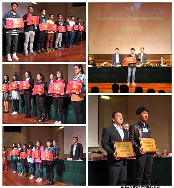 本网讯 2017年4月16日下午,由共青团内蒙古师范大学委员会主办,物理与电子信息学院承办的首届“直通挑战杯”课外学术科技作品竞赛颁奖仪式暨优秀作品展在逸夫楼音乐厅举行。校团委副书记贾世琦、物理与电子信息学院特古斯、何小龙、刘美玲等学院领导出席颁奖仪式。