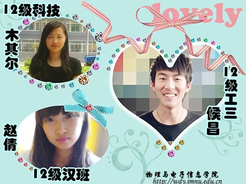 在刚刚结束的内蒙古师范大学校级第十三届“百灵杯”大学生文艺汇演中,我院涌现出了一批非常优秀的舞蹈演员,不间断的训练磨不掉他们的意志,辛苦的汗水淹不了他们热情,最终的成功离不开他们的努力,他们分别是: