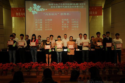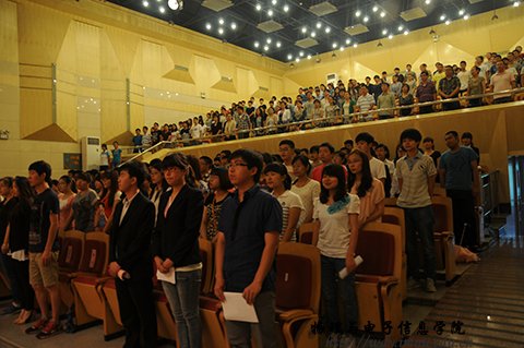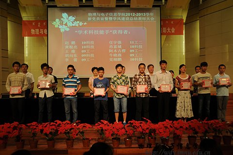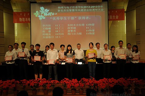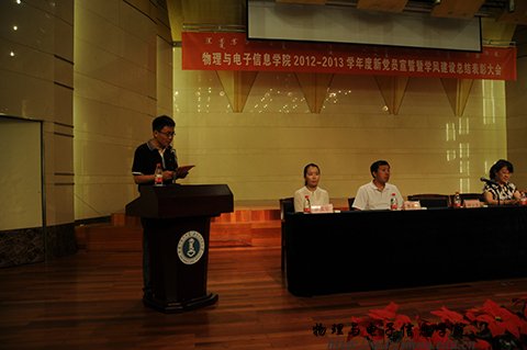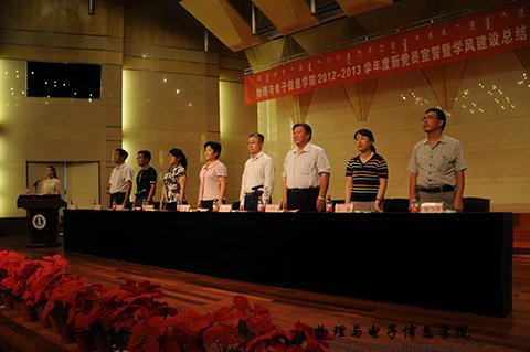 2013年7月1日,我院在逸夫楼音乐厅隆重召开2012—2013学年度新党员宣誓暨学风建设总结表彰大会。参加大会的领导有:党总支书记阿梅老师、院长特古斯教授、副院长吉日嘎拉教授、副院长刘美玲老师、党总支副书记何小龙老师、物理系主任张敏老师、电子系主任梁学军老师、实践创新部主任曹永军老师以及学院各班级班主任和任课老师。大会由团总支萨其尔主持。