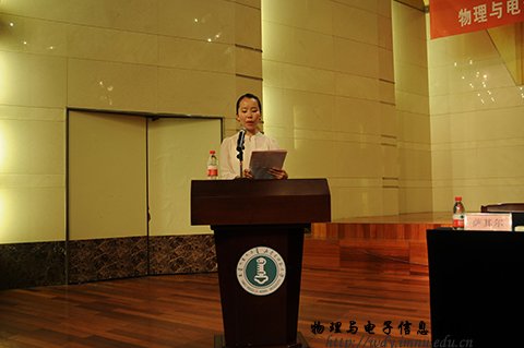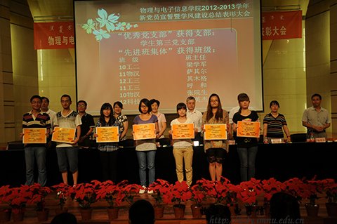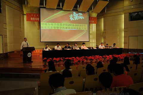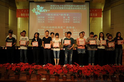 大会首先由阿梅老师致辞,对新党员提出两点建议,一是要提高自身组织纪律性,发挥先锋模范作用,促进学风建设;二是要加强学习实践,做一名合格党员,不断提高为同学服务的本领和能力。之后大会进行了庄严的新党员宣誓,由学工办宋志强老师带领47名党员在鲜红的党旗下宣读了入党誓词。紧接着何小龙副书记宣读了表彰决定。与会嘉宾为学风建设方面取得优异成绩的先进集体及个人进行了颁奖。获奖学生代表09级物理汉班王鑫和11级物理汉班郭迎婷分别进行发言,感谢学院及老师们对学生的辛勤付出,决心继续发扬优良学风,再接再厉,再创辉煌。